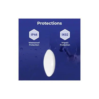 Un elemento importante delle plafoniere e delle applique LED è il loro livello di proezione IP, che indica la protezione contro l'ingresso di polvere e umidità/acqua. A partire da IP65, un apparecchio di illuminazione è a prova di polvere e acqua. Il valore IP di questa plafoniera LED è: IP44. Stai cercando una plafoniera LED per esterni? Allora presta attenzione alla protezione da urti e impatti, ovvero il valore IK, che per questa lampada è IK02 - 0.20 Joule.