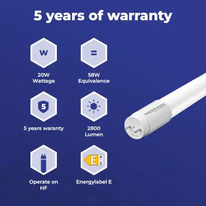 Il Noxion Tubo LED T8 Avant Extreme (HF) High Output 20W 2800lm - 830 Luce Calda | 150cm - Sostitutiva 58W è l’alternativa perfetta per il tubo fluorescente standard 58W nelle plafoniere con un reattore. Con questo tubo LED hai una garanzia di una vita media utile molto lunga e 5 anni Lampadadiretta.it di totale garanzia. .