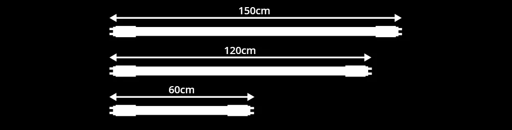 Le lunghezze più comuni per i tubi LED T8 sono 60cm, 90cm, 120cm e 150cm. Per i tubi T5 invece sono 55 cm, 85 cm, 115 cm e 145 cm. Prima di passare al LED controlla sempre la lunghezza dei tuoi vecchi tubi fluorescenti.