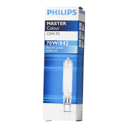 Le Philips CDM-TC 70W 842 G8.5 (MASTERColour) sono lampade a scarica compatte a ioduri metallici da 70W con base G8.5. Queste lampade a scarica a ioduri metallici presentano una vita media di 12.000 ore e sono caratterizzate da un'elevata efficienza energetica. La resa dei colori é molto buona grazie all'indice di resa cromatica di 80-89Ra. Sono inoltre dotate di un filtro UV che limita lo scolorimento degli oggetti illuminati. Un'altra proprietà da sottolineare é l'intensità del flusso luminoso: ben 5900 lumen!