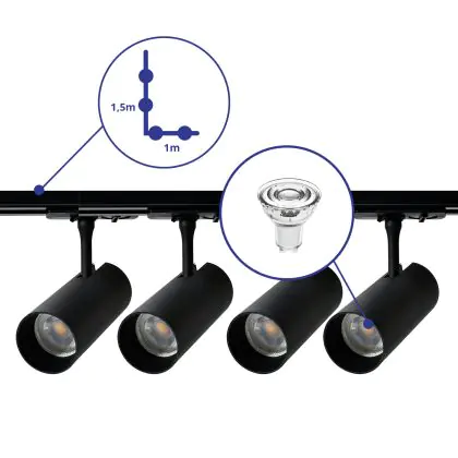 Descrizione Set completo 1-Fase Rail L 1 x 1,5 Metro Nero | incl. 4x Faretti + GU10 2700K 3W Dimmerabile + Tappo Di Chiusura, Connettore di Alimentazione e L -Connettore